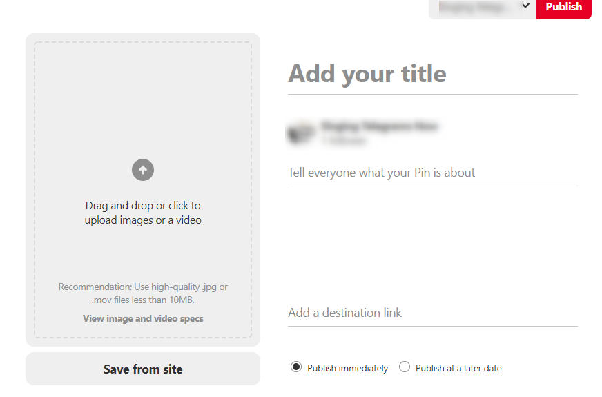 You can now add Pins to this board, for this you have to add your Pin’s title, an image or a video which you want to Pin, a small description about your Pin, destination link and then choose the board where you want to publish your Pin and click on “Publish” button (a red button on top).